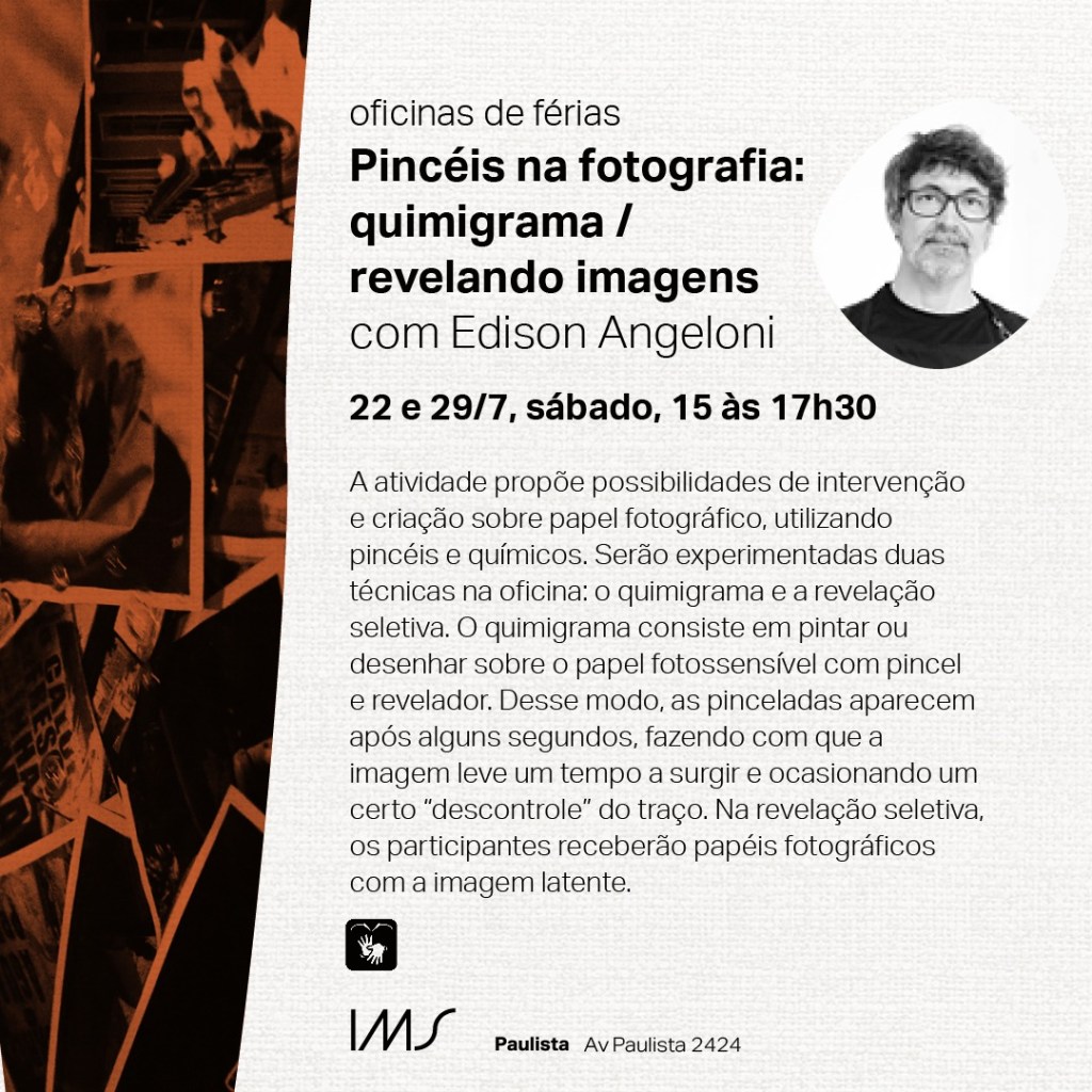 Voltado para o público infantil durante as férias de julho, essa oficina consistiu em possibilidades de intervenções e criações no papel fotográfico. Imagens já sensibilizadas eram reveladas a pinceladas e em outra sala bem clara outros pincéis eram usados para desenhar e pintar sobre os papéis sensíveis à luz, o Quimigrama.